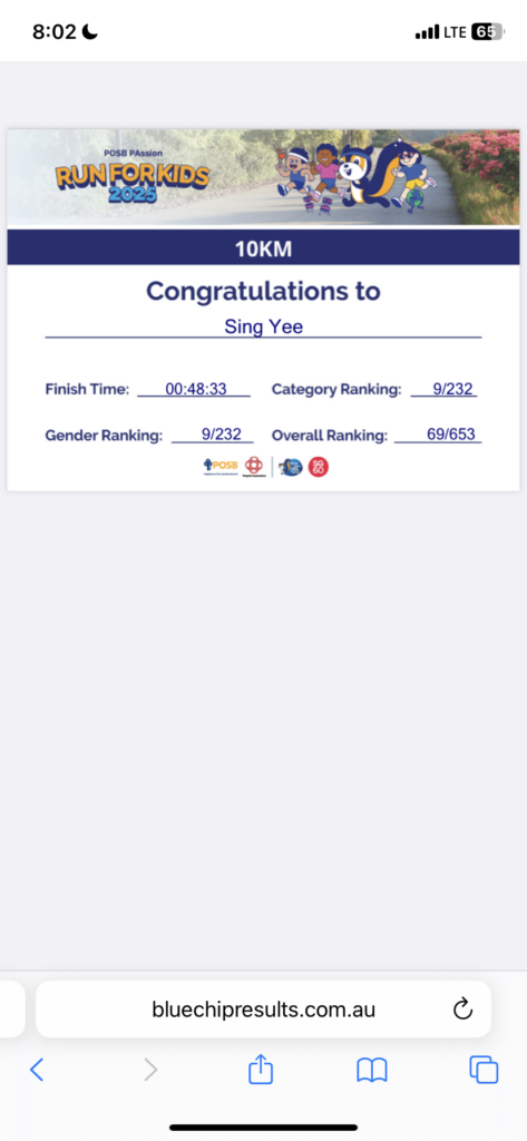 The 10 km races in Singapore now starts early at 6 am, this race was at the Marina Promontory. Actually, I was pretty nervous about this 10km short run because I was ready to give it all out again and I really hope to be able to do it below 50min. Sketchers run was a little disappointing dropping from the 45min last year to 48 min. I think I after all the whacking to my body for Ironman, the piriformis is getting really bad. But nevertheless I am giving it a shot this time.