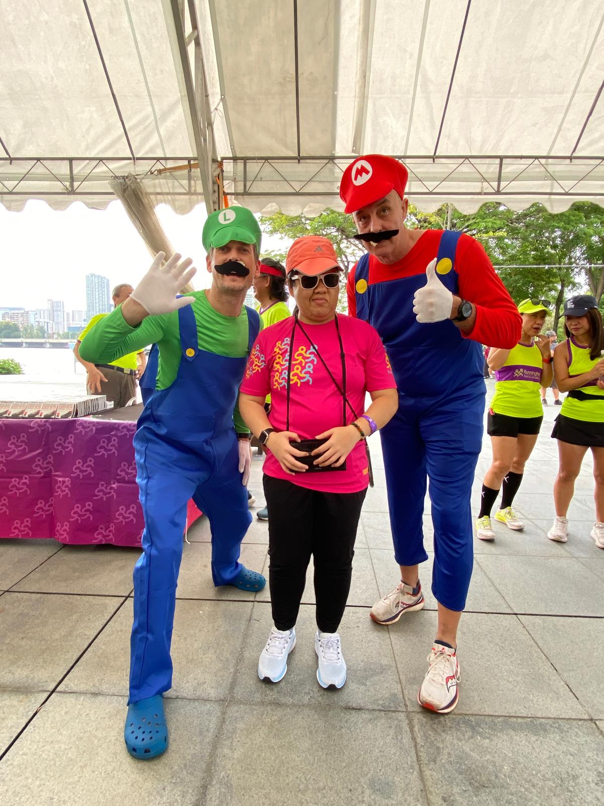 The event took place 15 Nov at the Stadium Kallang. The tentage was set up at the outdoor arena beside the volley ball court. There were registration, goodie bag booth and the AV systems were set up with music and stuff. All the usual suspects for Running Hour were there, Mike and Gilles dressed up as Mario and Lugi to cheer the crowd. Arthur and Elaine with their kids, Andreas, the rest of the kids. Some of the members doubled up as volunteers to marshal the crowd through the route.